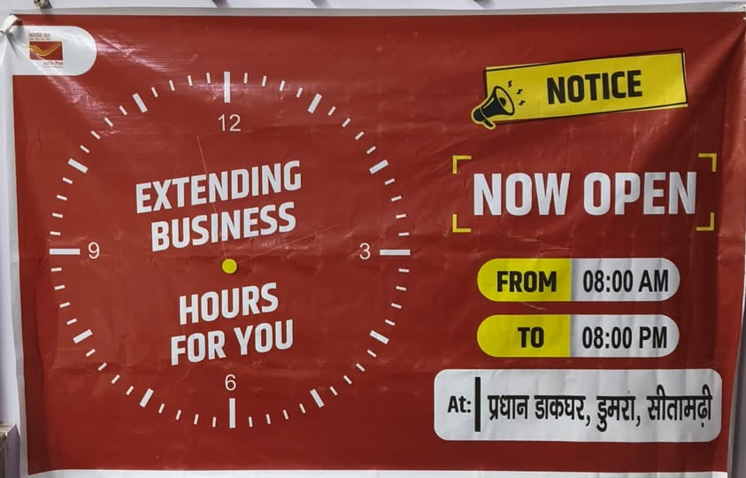 सीतामढ़ी जिले के लोगों के लिए अच्छी खबर! जिला प्रशासन व डाक विभाग की पहल से Sitamarhi Head Post Office (प्रधान डाकघर, डुमरा) में डाक बुकिंग का समय बढ़ाकर सुबह 8:00 बजे से रात 8:00 बजे तक कर दिया गया है। यह कदम जनता की सुविधा को ध्यान में रखते हुए उठाया गया है।