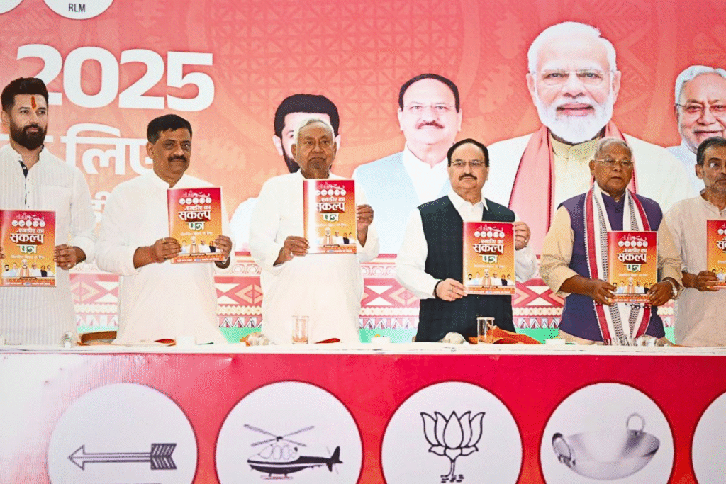 इस दिन पटना के एक होटल में एनडीए के सभी घटक दलों के प्रमुख नेता ने मिलकर अपना ‘संकल्प पत्र 2025’ के नाम से घोषणा पत्र जारी किया है. इस मौके पर मुख्यमंत्री नीतीश कुमार, भाजपा के राष्ट्रीय अध्यक्ष जेपी नड्डा, केंद्रीय मंत्री जीतन राम मांझी, चिराग पासवान और सांसद उपेंद्र कुशवाहा समेत अन्य भी उपस्थित थे. पार्टी ने इस घोषणा पत्र को विकसित बिहार का ब्लू प्रिंट बताया है.