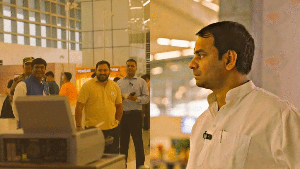 इंडिया महागठबंधन के मुख्यमंत्री पद के उम्मीदवार और आरजेडी नेता तेजस्वी को विकासशील इंसान पार्टी (वीआईपी) के प्रमुख मुकेश सहनी के साथ एयरपोर्ट पर मौजूद रहते हैं. इसी दौरान यूट्यूबर तेजस्वी से मिलने जाता है और तेजस्वी भी मुस्कुराते हुए उसका अभिवादन करते हुए पूछते हैं ‘शॉपिंग करवा रहे हैं भैया?’. इसके जवाब में यूट्यूबर कहते हैं ‘वो हमको गिफ्ट दे रहे हैं’.